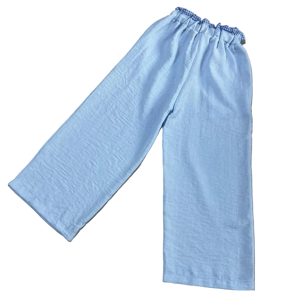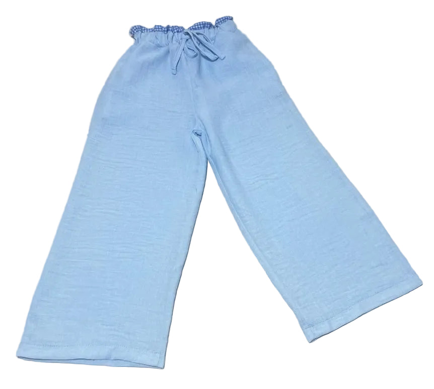 This adorable outfit features a soft white tee decorated with delicate gingham bows in playful gingham shades, paired with lightweight sky-blue wide-leg pants for a relaxed, breezy fit. Designed with both comfort and style in mind, itโs perfect for everyday wear, playdates, or casual outings.